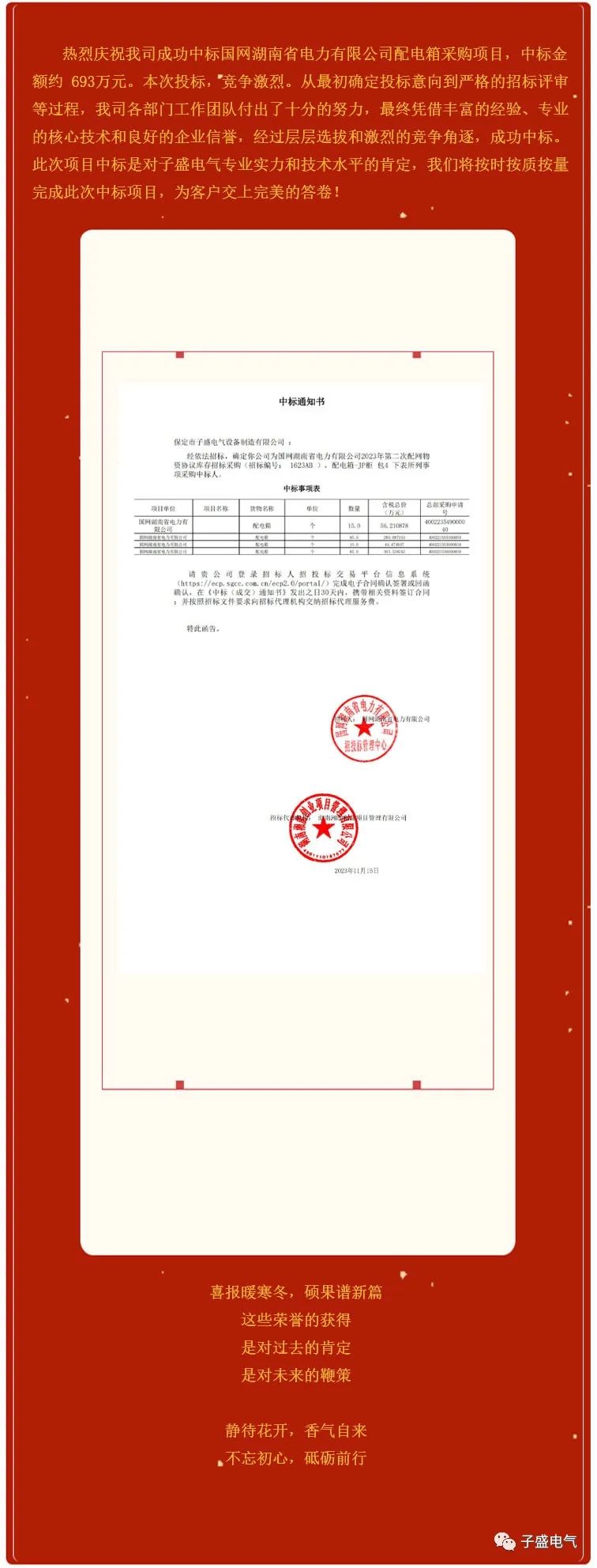 喜报 — 喜报暖寒冬,硕果谱新篇!祝贺公司成功中标国网湖南省电力有限公司项目
